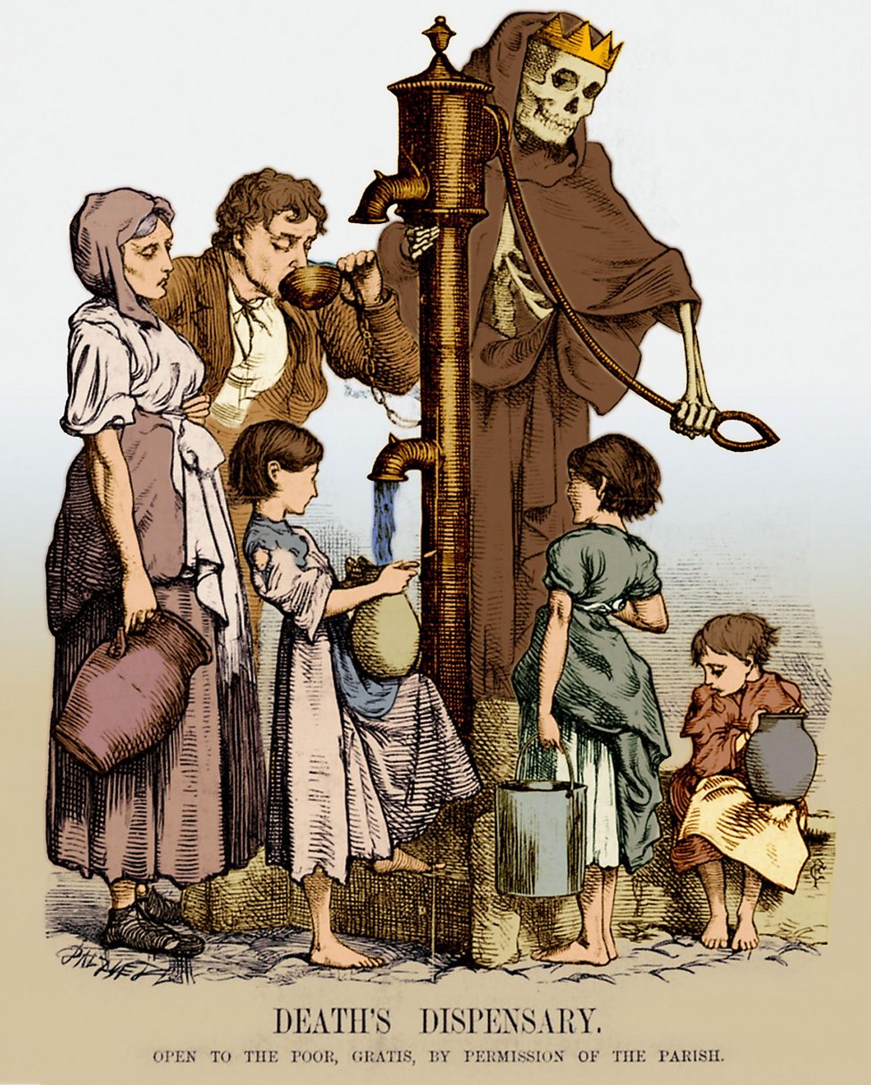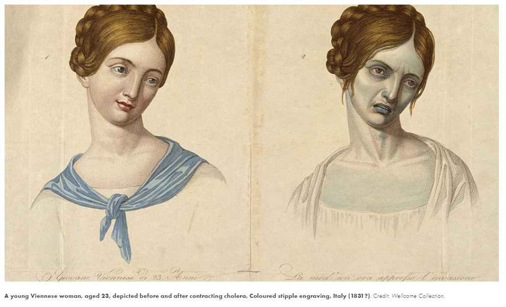Cholera in the 19th century was especially terrible because of its fast, violent symptoms, high death rate, and lack of understanding about its cause. The disease hit the poor in crowded, dirty cities the hardest. People suffered severe stomach cramps, vomiting, and diarrhoea, which quickly led to dehydration. Their eyes would sink, their skin would shrivel and turn blue from lack of oxygen. This is why it was called the “blue death.” Many died within a day of getting sick. The speed and horror of cholera made it the most feared disease of its time.