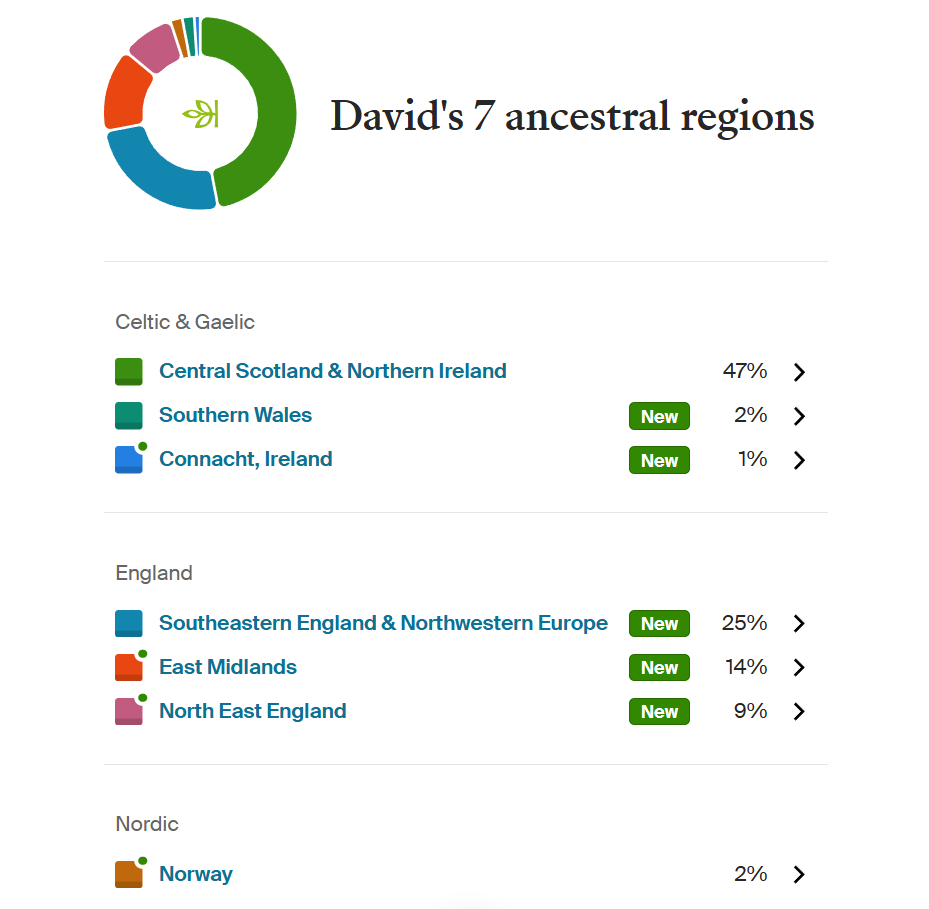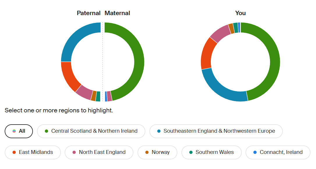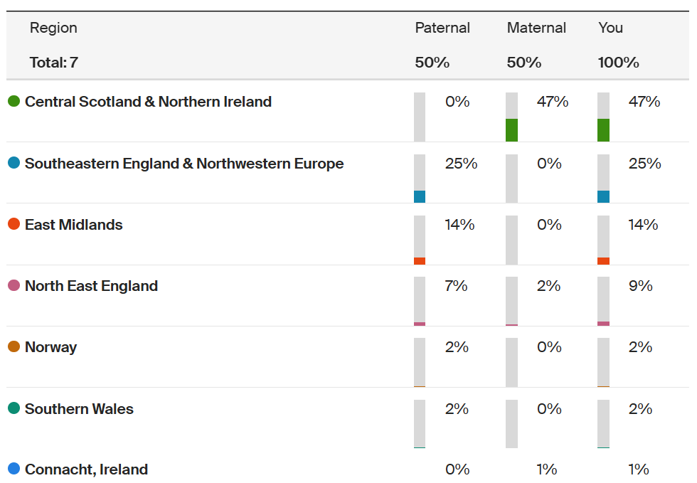 Like everyone, I inherited half my DNA from my mother and half from my father. Before receiving my DNA test results, I expected my ancestral regions to be split about fifty-fifty between Scotland and England, since my mother was Scottish and my father English. However, I was surprised to see that SE England and NW Europe accounted for almost a quarter of my ancestral regions, traced through my father’s side. About 20% of my DNA is from other parts of England, with a small percentage of Norwegian and Welsh DNA, also through my dad. The rest comes from Gaelic regions, mostly Central Scotland, with the remainder from Connacht, Ireland.