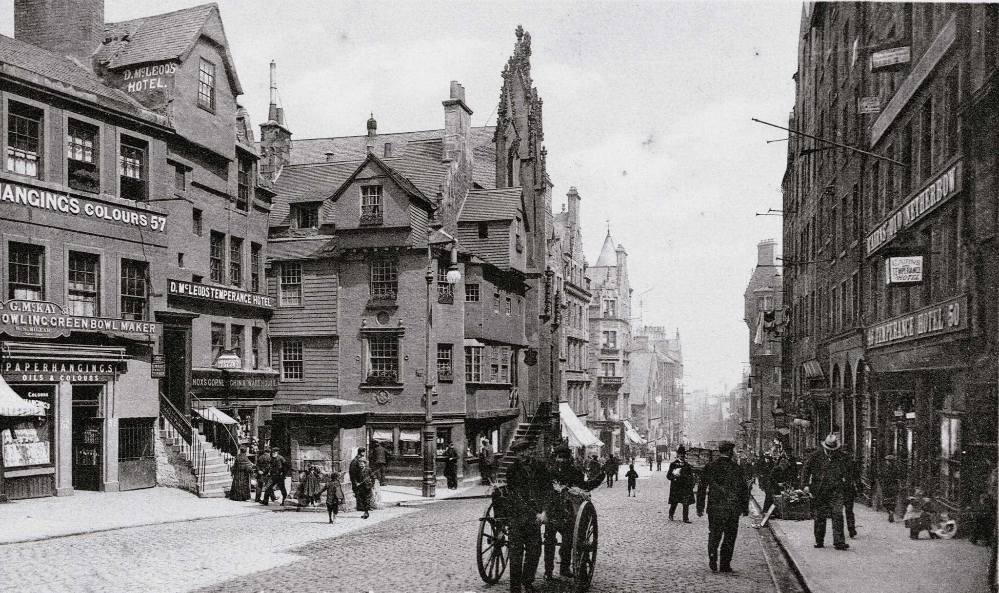 This photograph, looking down the High Street, was taken around the end of the 19th century. The Netherbow Temperance can be seen on the left behind the Netherbow Wellhead.