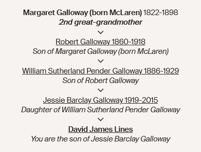 Margaret Galloway (born McLaren) was born on 7 January 1822 in Inveraray, Argyll, to Maria Spence or Spenser and John McLaren and baptised in the town on 27 January.