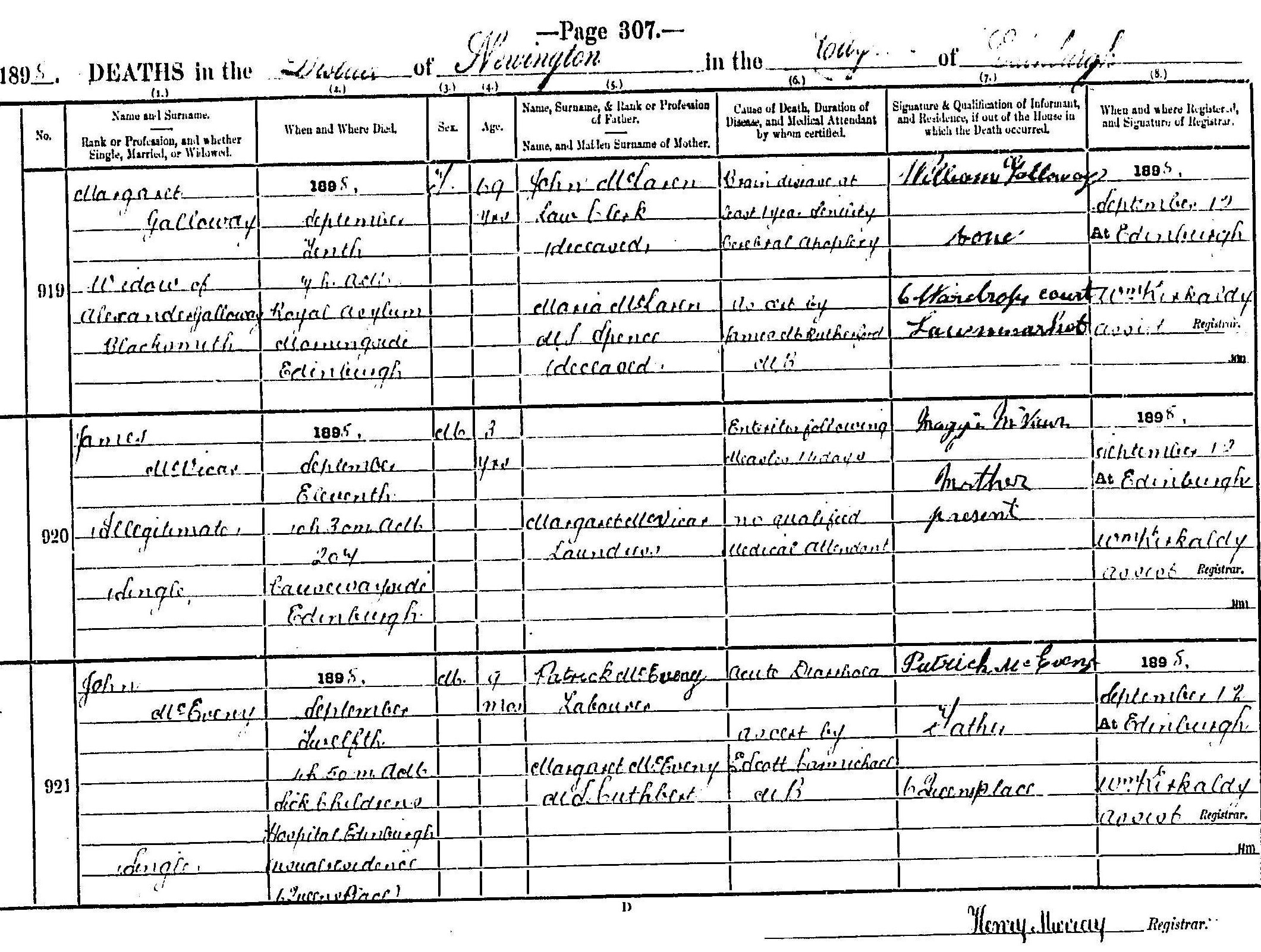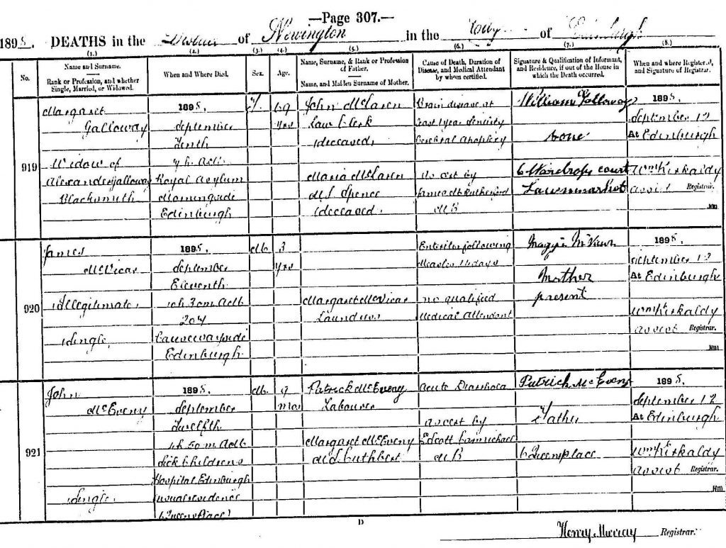 By 1861, Margaret had four sons and two daughters, and had moved to 54 Grassmarket, where she remained for two years after her husband’s death in 1883. Margaret died in the Royal Asylum, Morningside, from a stroke after spending a year in the hospital.