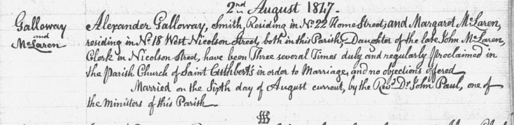 There is little available information about Margaret or her family in Argyll. By the time she married Alexander Galloway on 6 August 1847, her family had already moved to Edinburgh where her family lived on West Nicholson Street.