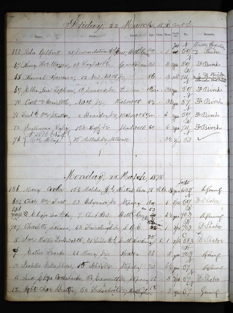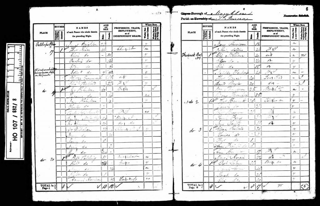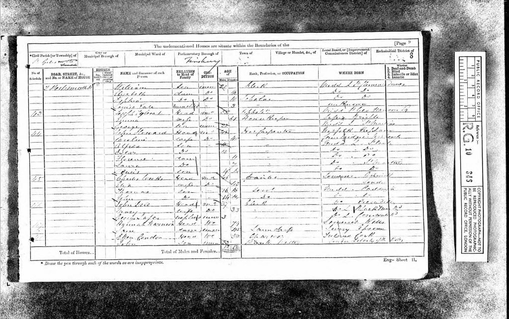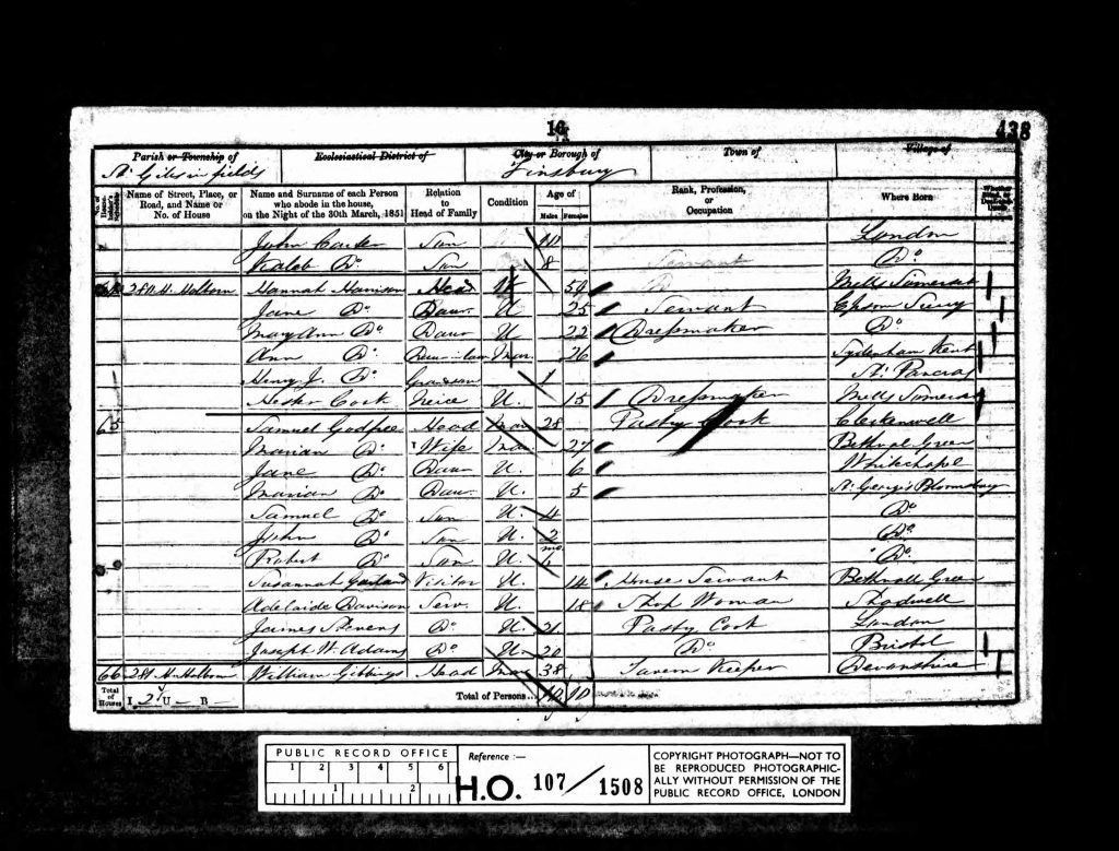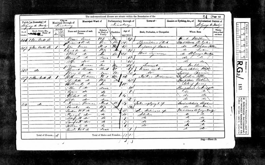 At age 69, Hannah lived at 9 New North Street with her daughter Mary Ann, and both worked as dressmakers. Ten years later, Hannah was still in the Holborn area and had moved to 2 Portsmouth Street with her daughter, Jane, who worked in a laundry.