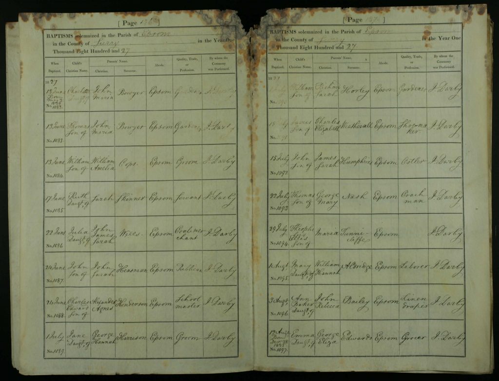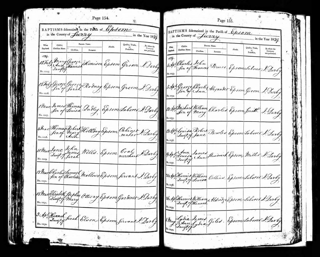 She married George Harrison in 1821 at St Andrew’s Church, probably in Cobham, which is about 11 kilometres from Epsom. They lived in Epsom and had two children: Jane, born in 1826, and Mary Ann, born in 1829. I have not found much about their years in Epsom, except that George is listed as a groom on his daughters’ baptism records.