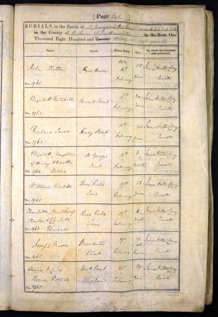 By 1809, Henry had left Queen Camel for Southampton, where he met and married Martha Warham on 27 November 1809 in All Saints Church. Between 1810 and 1827, they had five children: Mary Anne (1810), Elizabeth (1819), Sarah (1826), and Emma (1827). There is a burial record for what may be their sixth child. It notes she is the child of Henry and Martha Willis and was buried on 19 February, aged six months. However, she is also called Elizabeth, like their second child, who is now eleven.