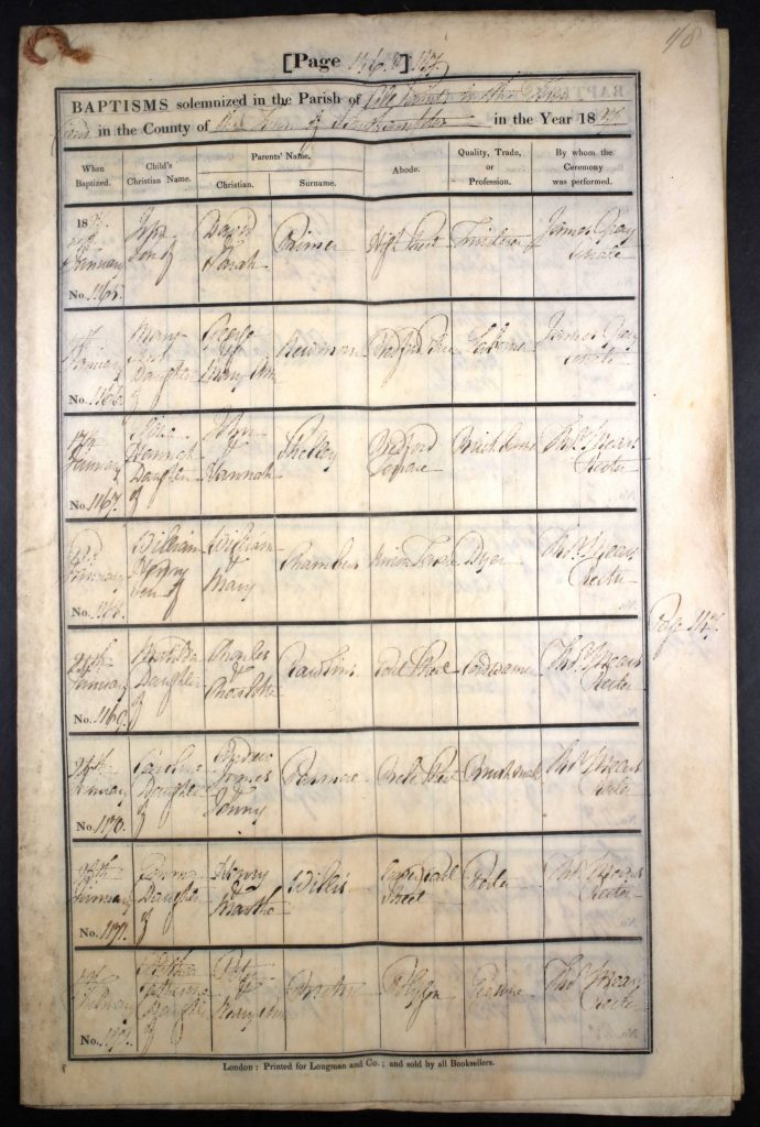 In 1827, his daughter Sarah was baptised in All Saints, and the document shows the family living on Lower East Street. Lower East Street was the name for the eastern continuation of East Street outside Southampton’s medieval East Gate. By 1827, it was part of the built-up eastern suburb running towards St Mary’s and Marsh Lane.