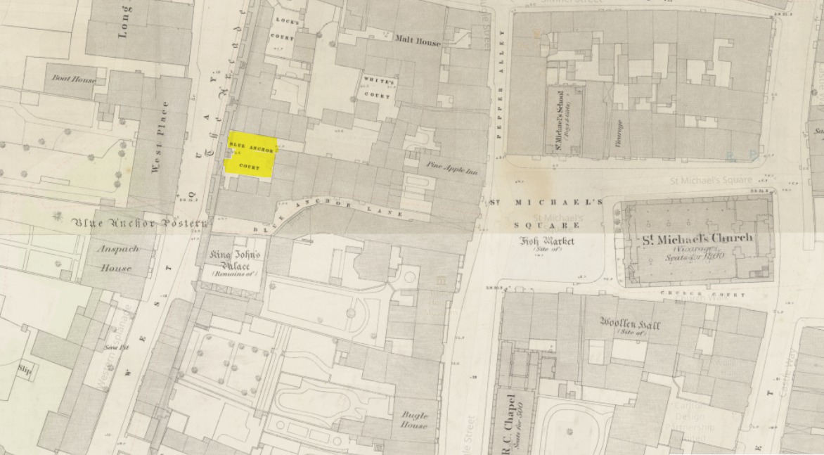 The court was once the site of the “Blue Anchor Inn”, named for the fact that when nearby ships brought up their anchors, they would be covered in blue clay.