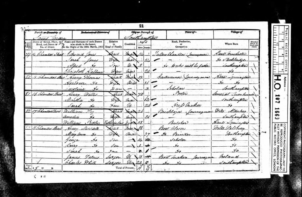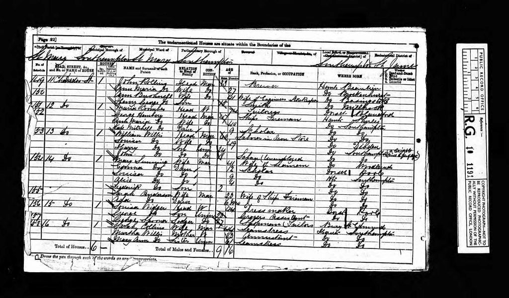 In 1841, Martha was living in the Binstead area, about 40 km north of Southampton. The census records her as living only with James Willis. I am not sure who this is, whether a son or a brother, as there is no further information. It is unclear what happened to the family at this time, but the 1851 census shows her living with her husband, Henry, and their daughter, Sarah, at 81 Chandos Street, Southampton.