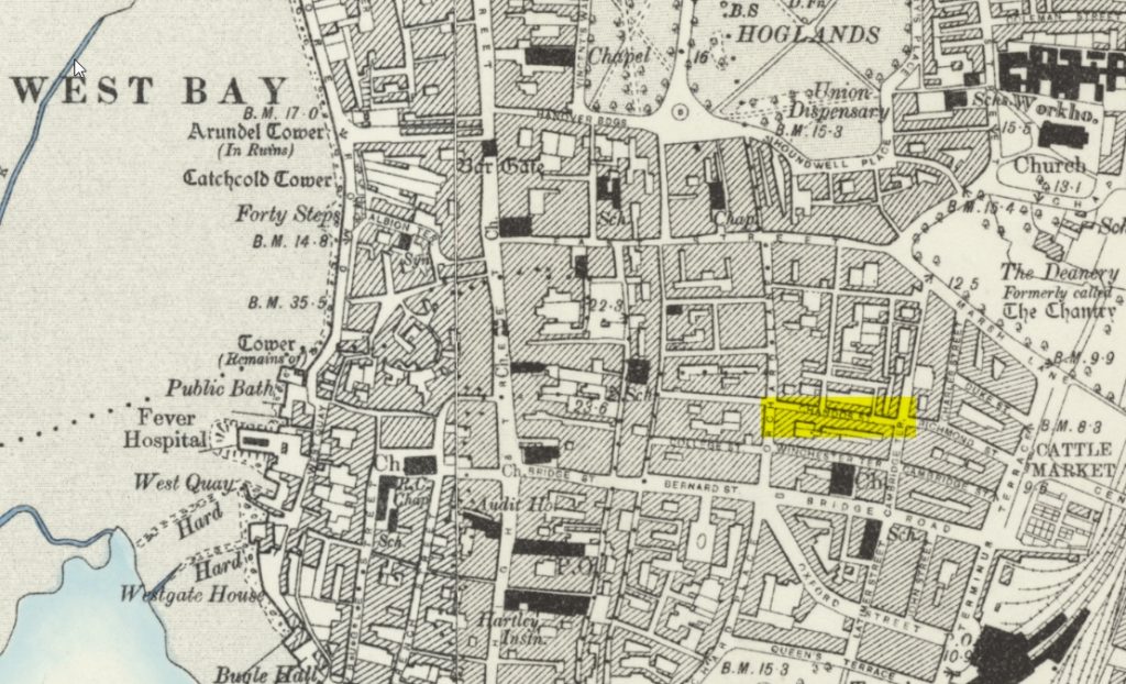Chandos Street was in the St. Mary’s area of Southampton. The area was a densely populated district with rows of terraced housing, courts, and small workshops. It was close to the docks and the town centre, making it a typical working-class neighbourhood. The street no longer exists, as it was demolished during slum clearances and post-war redevelopment.