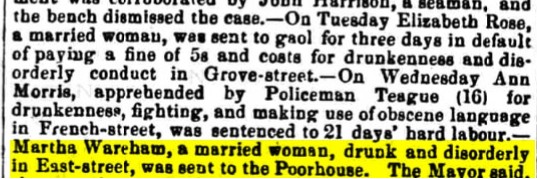 Martha’s husband, Henry, died in 1856. On 13 July 1859, Martha was arrested on East Street for being drunk and disorderly and was sent to the poorhouse.
