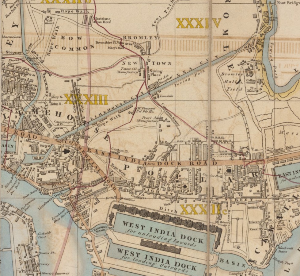 At the north end of Hill Place Street was the Limehouse Cut. Built in 1770, it was London’s first canal, connecting the River Thames to the River Lea. The canal gave barges a direct, tide-free route to carry goods like coal, pig iron, and salt, so they didn’t have to take the long way around the Isle of Dogs or deal with the Thames tides. In the early 1800s, factories and workshops sprang up along the canal, including lime kilns (which gave the area its name), sawmills, soap makers, potash works, cable makers, gasworks, and chemical factories that made tar, varnish, ammonia, and more.