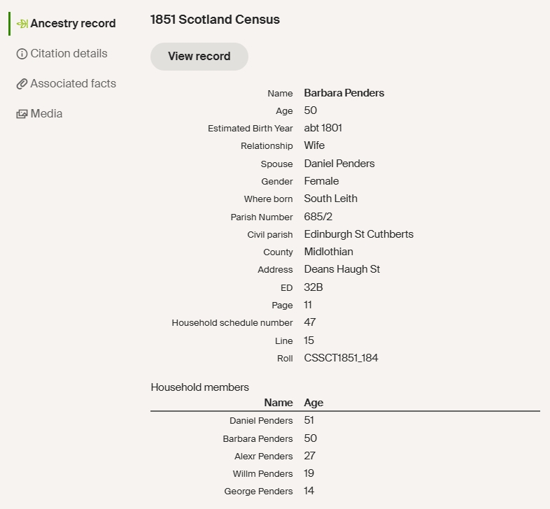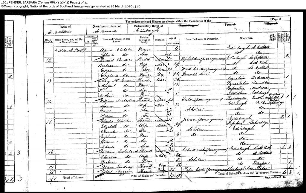 Barbera Plenderleith married Daniel Pender on 8th Nov 1867 in Edinburgh’s St. Cuthbert’s Parish. Between 1824 and 1840, they had nine children: Euphemia (1824), Daniel (1826), Alexander (1826), John (1828), Christina (1831), Georgina (1835), William (1836), Jane (1836), and George (1840).