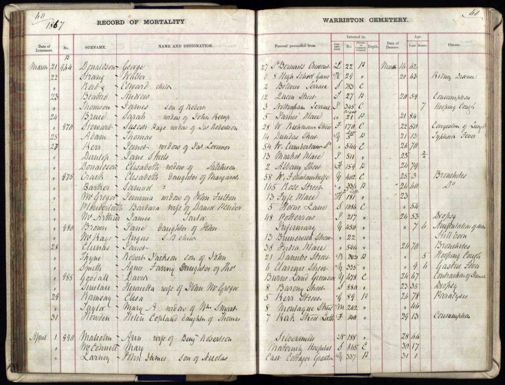 Barbara died on 23 March 1867 from acute bronchitis, and The Record of Mortality shows that she is buried in Warriston Cemetery.